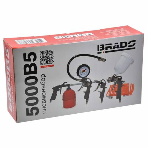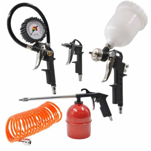 Состоит из 5 элементов: краскопульт HVLP, пистолет продувочный, пистолет моечный, пистолет для подкачки шин с манометром, шланг спиральный